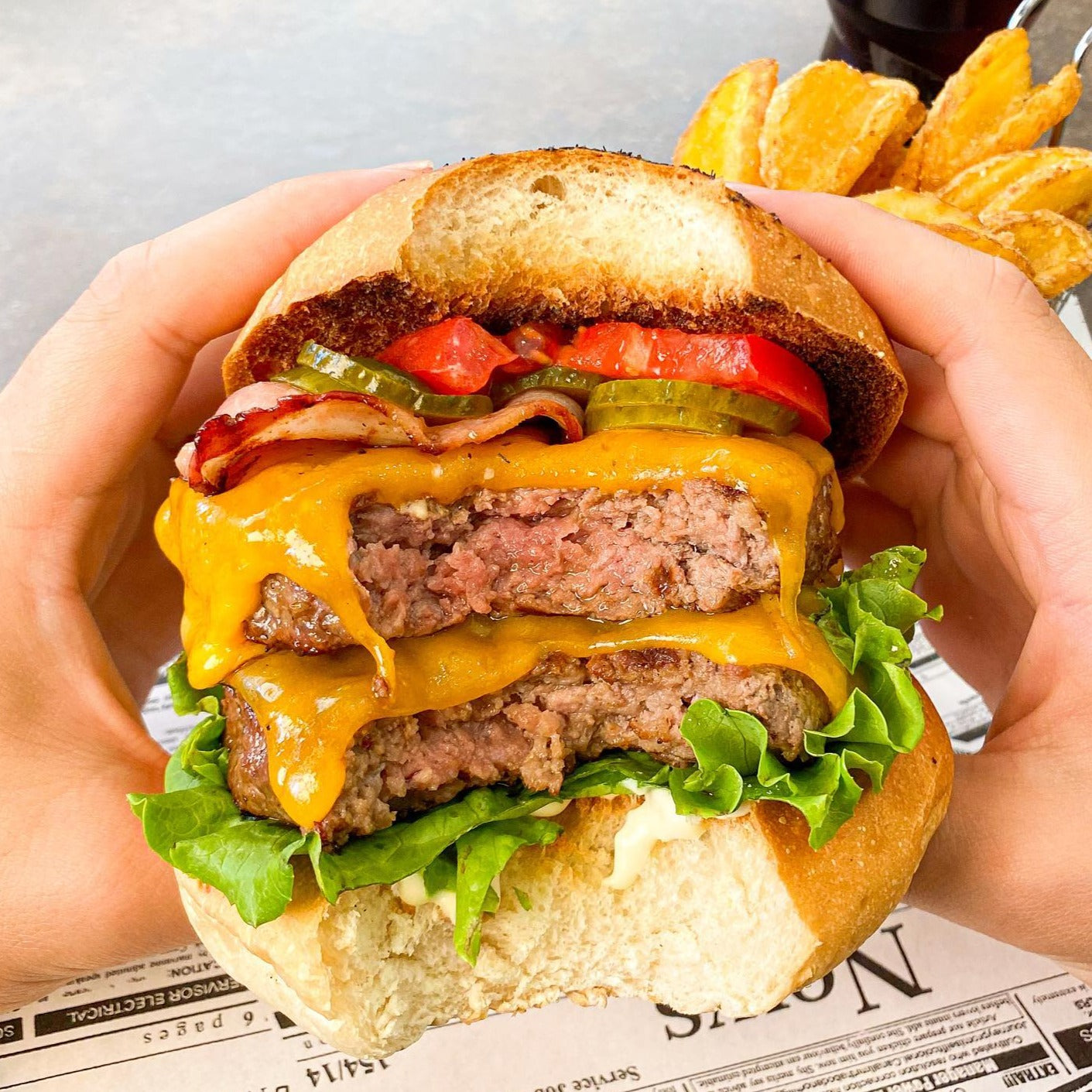 doble carne 100% Bistro Burger, pollo o mixta, queso, bacon, pepinillos, tomate, lechuga y salsa de la casa.