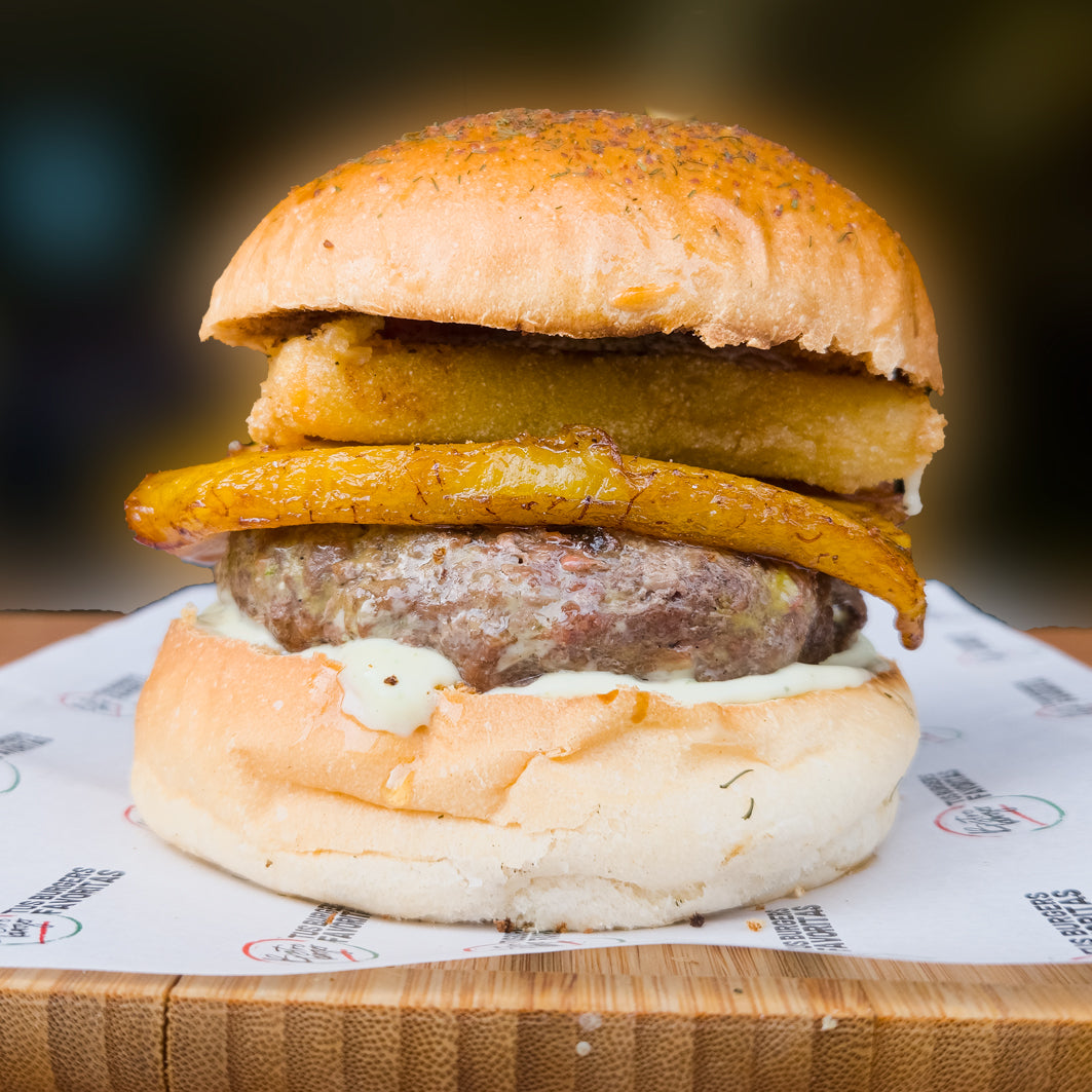 200g de ternera cubierta de plátano macho maduro frito, queso curado empanado frito y salsa de la casa.