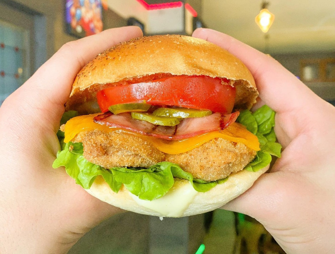 filete de pollo crujiente, queso, bacon, pepinillos, tomate, lechuga y salsa de la casa.