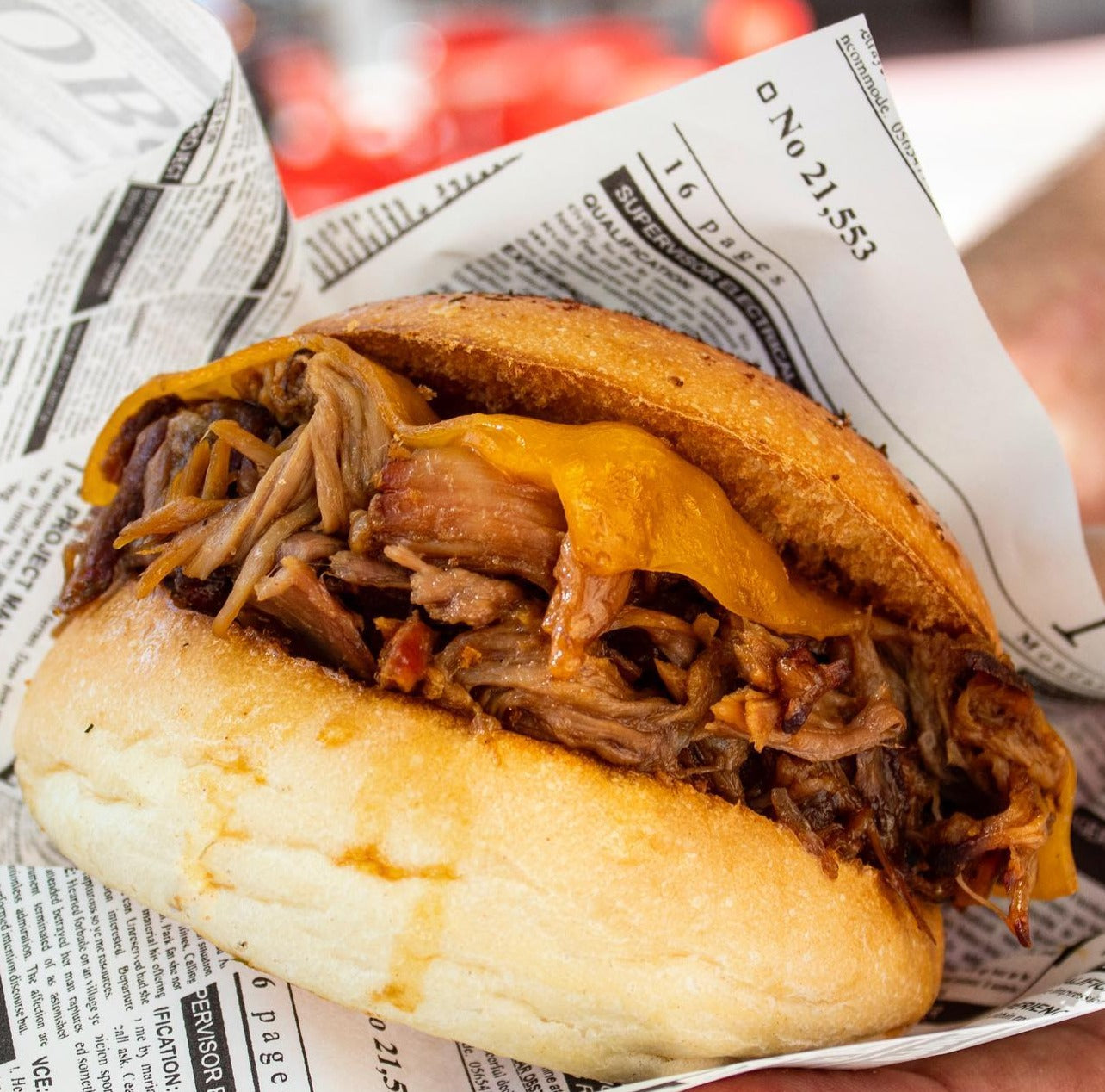 carne de cerdo horneada a fuego lento con especies, bacon, queso cheddar y salsa de la casa