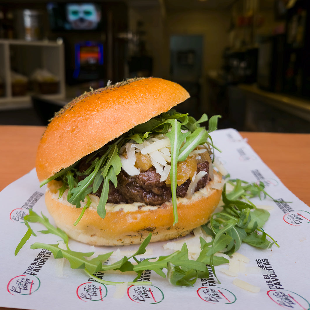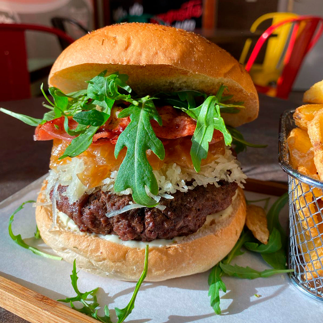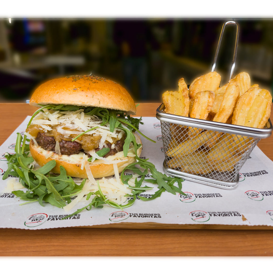 Esta hamburguesa viene con Patatas Fritas o Aros de Cebolla