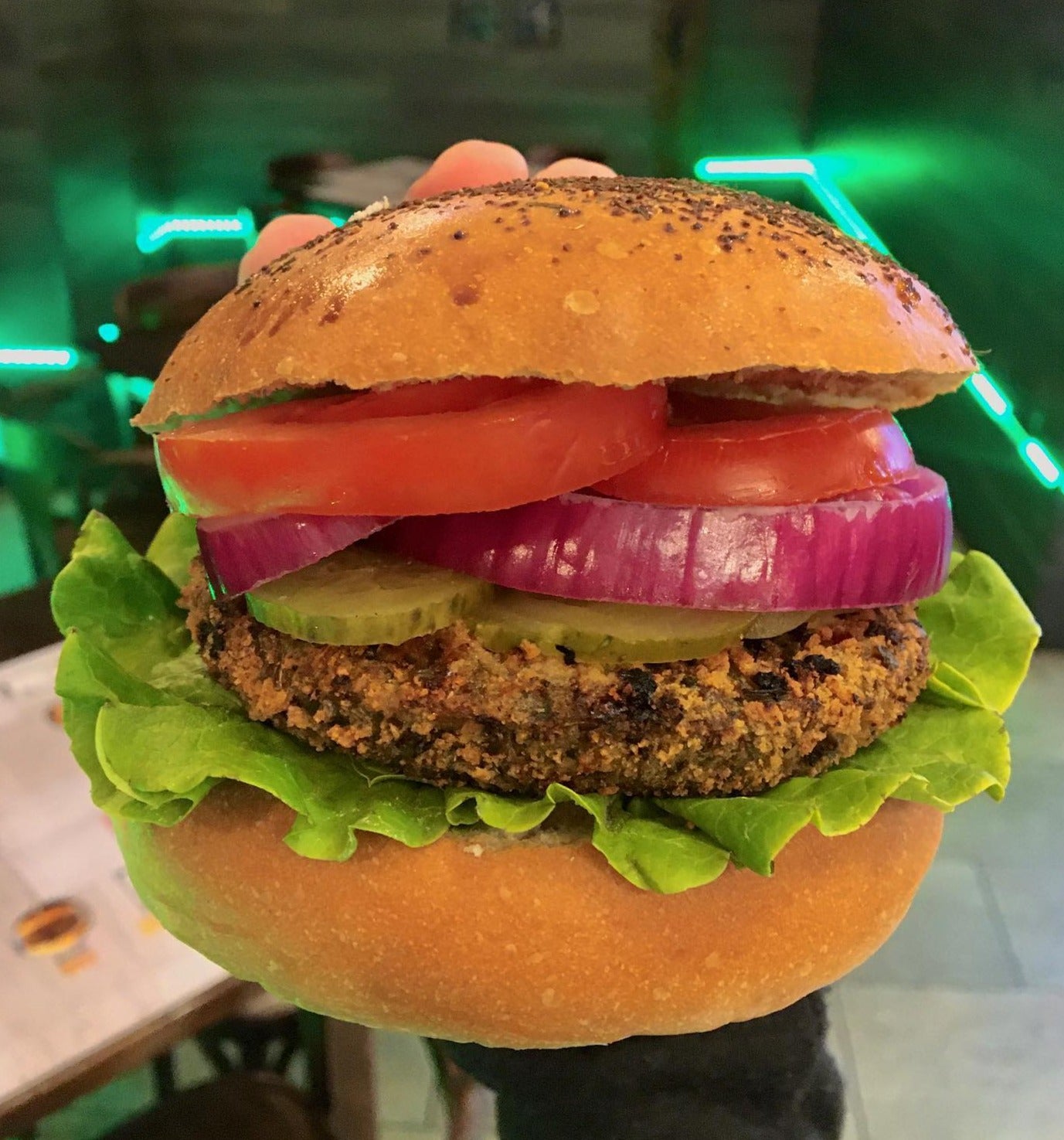 hecha a base de proteína de guisante, lechuga, tomate, cebolla, pepinillo y salsa de la casa.